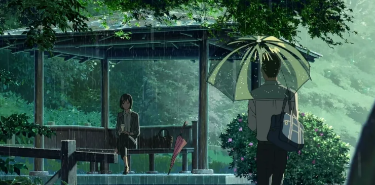 신카이 마코토 감독의 작품은 늘 아름다운 작화로 주목받지만, 언어의 정원은 그중에서도 특히 ‘비’를 활용한 연출이 돋보인다. 영화는 거의 대부분 비 오는 날의 신주쿠 공원을 배경으로 하고 있는데, 여기에 신카이 마코토 특유의 빛과 그림자, 섬세한 배경 묘사가 있어 더 강한 몰입감을 준다.